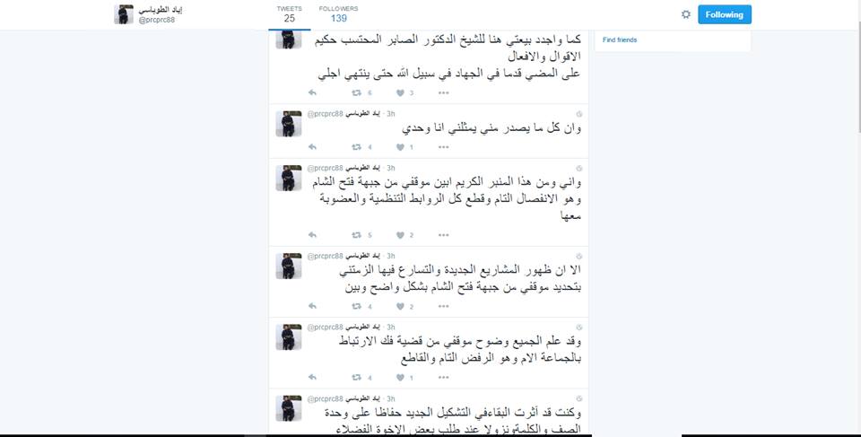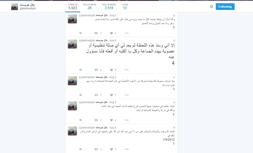 وكان “بلال خريسات” الملقب ب “أبي خديجة الأردني”، سبق أبو جليبيب في إعلان انفصاله عن “فتح الشام”، عبر حسابه على تويتر بقوله “إلّا أنني ومنذ هذه اللحظة، لم يعد لي أي صلة تنظيمية أو عضوية بهذه الجماعة، وكل ما أكتبه أو أفعله فأنا مسؤول عنه”.