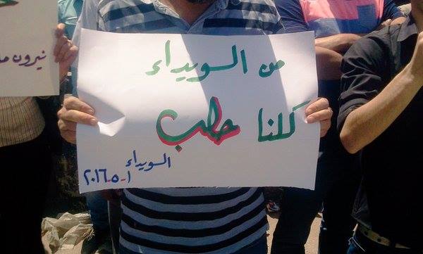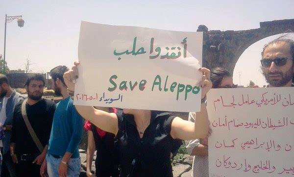 ورفع المعتصمون لافتات تعبر عن تضامنهم مع مدينة حلب، التي تتعرض لقصف يومي عنيف من قبل قوات النظام، متجاهلين القبضة الأمنية التي يفرضها النظام ومخابراته على المدينة التي لا تزال تخضع لسيطرته.