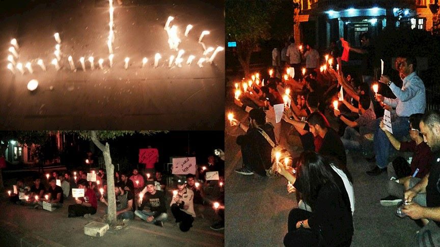 وكتب المعتصمون بالشموع اسم “حلب” على أرض الساحة، تضامنا مع المدينة التي تعرضت لعشرات الغارات الجوية من قبل قوات النظام منذ قرابة 10 أيام.