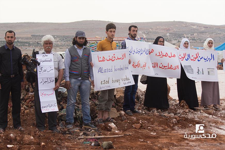 وحمَل الناشطون لافتات دونت عليها عبارات تنديد بجرائم الأسد وحليفته روسيا، كما أكدت على ضرورة محاسبة كافة المتورطين بالدماء السورية، متهمين أمريكا بتقديم الضوء الأخضر للنظام وروسيا على ما يقومان به من جرائم.