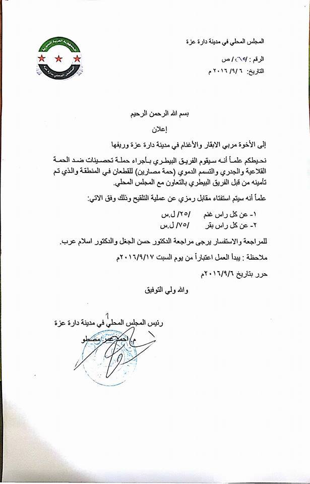 وفي سياق منفصل أعلن المجلس المحلي في المدينة عن إجراء حملة تحصينات ضد “الحمى القلاعية، والجدري، والتسمم الدموي” للأبقار والأغنام، من قبل الفريق البيطري، وذلك اعتباراً من 17 الشهر الجاري، مقابل أجر رمزي 25 ليرة عن كل رأس غنم و 75 عن كل رأس بقر.