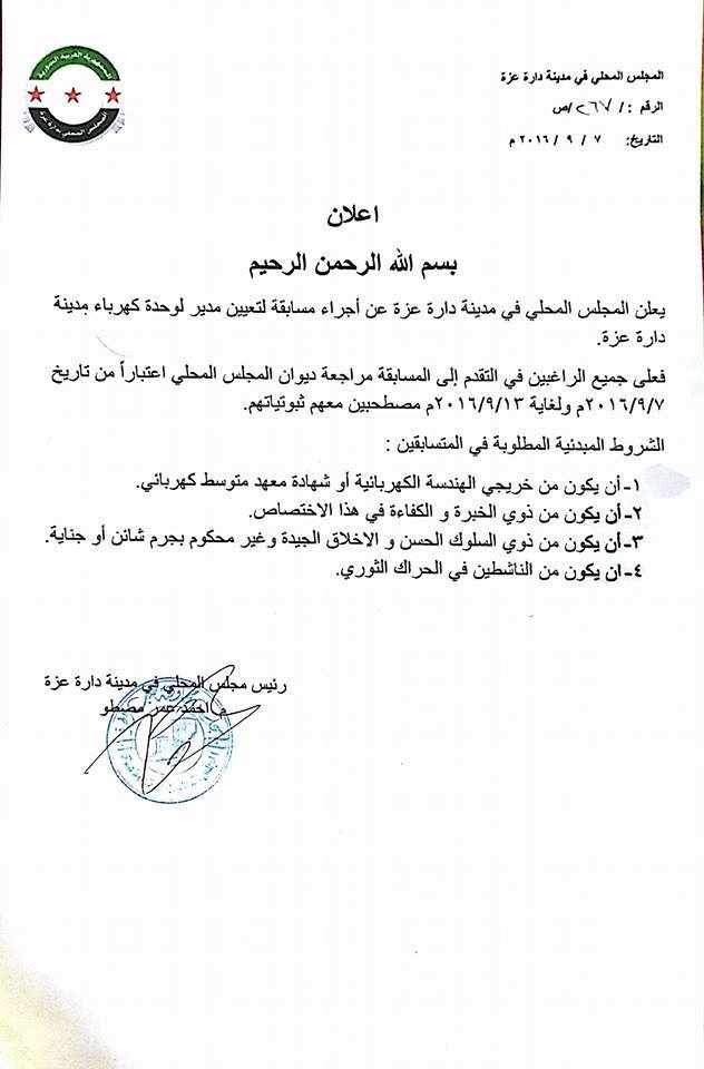 هذا وحدّد المجلس الشروط الواجب توافرها في المتقدم ب “أن يكون خريج هندسة كهربائية أو معهد متوسط كهربائي، أن يكون من ذوي الخبرة والكفاءة في هذا الاختصاص، وأن يكون حسن السيرة والسلوك وغير محكوم بجرم شائن أو جناية، وأن يكون من الناشطين في الحراك الثوري “.