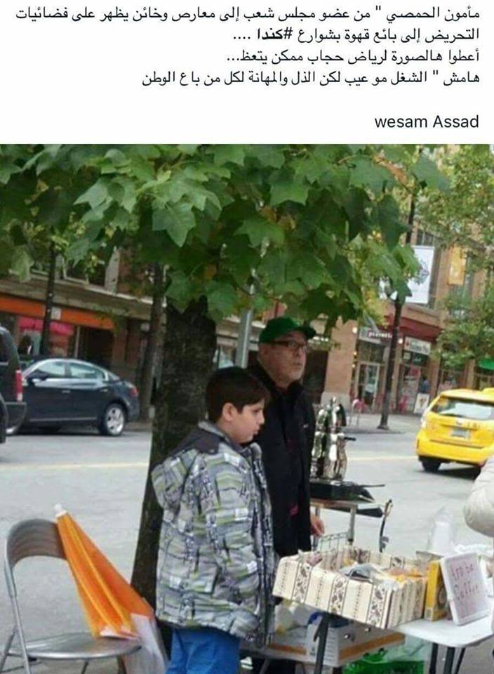 نشرت عدد من الحسابات الشخصية، عبر فيسبوك، يوم أمس، صوراً لعضو مجلس الشعب السوري السابق المعارض للنظام “مأمون الحمصي” وهو يبيع القهوة العربية في أحد شوارع كندا. وبدا جلياً خلال ساعات من نشر الصور، قيام العديد من الصفحات الموالية للنظام، توجيه إهانات للحمصي، معتبرين هذا العمل نهاية كلّ خائن، على مبدأ الشماتة.